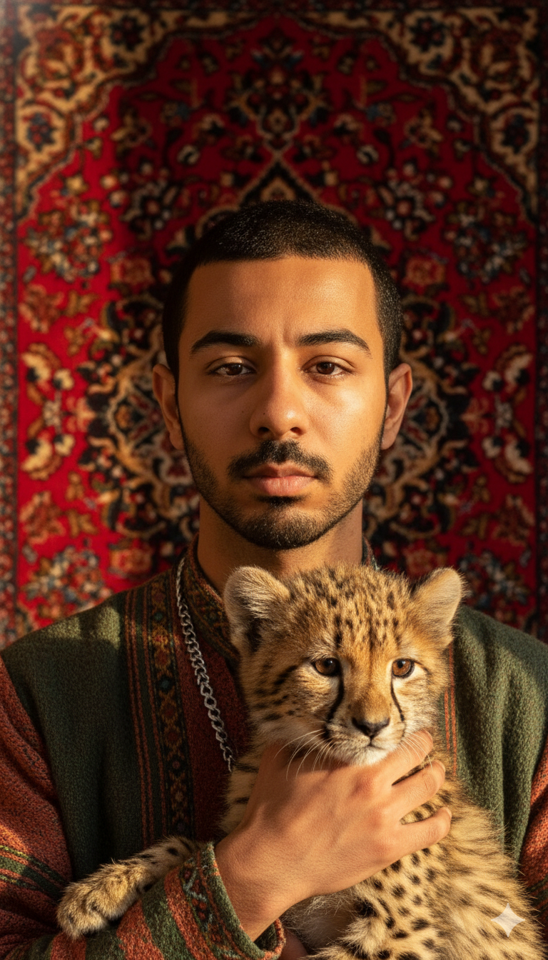 He is holding a **young Asiatic cheetah** close to his chest (symbol of Iran’s heritage). The cheetah appears calm and noble — detailed fur texture, golden tones that complement the lighting.