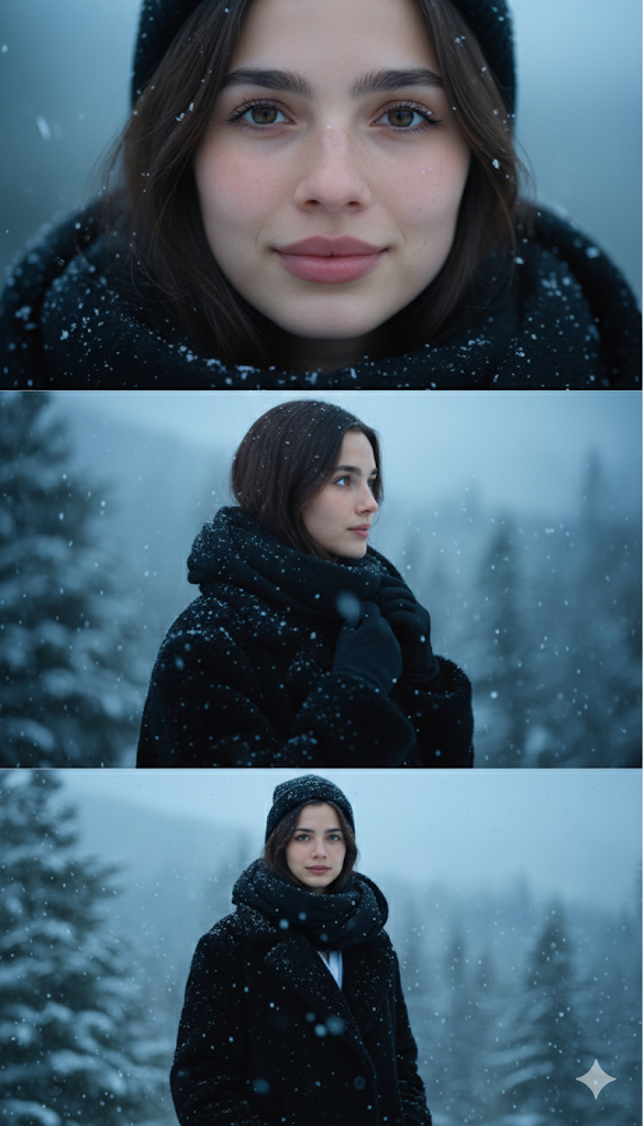 Ultra-realistic cinematic winter portrait collage, a single vertical composition divided into three horizontal panels (top, middle, bottom).