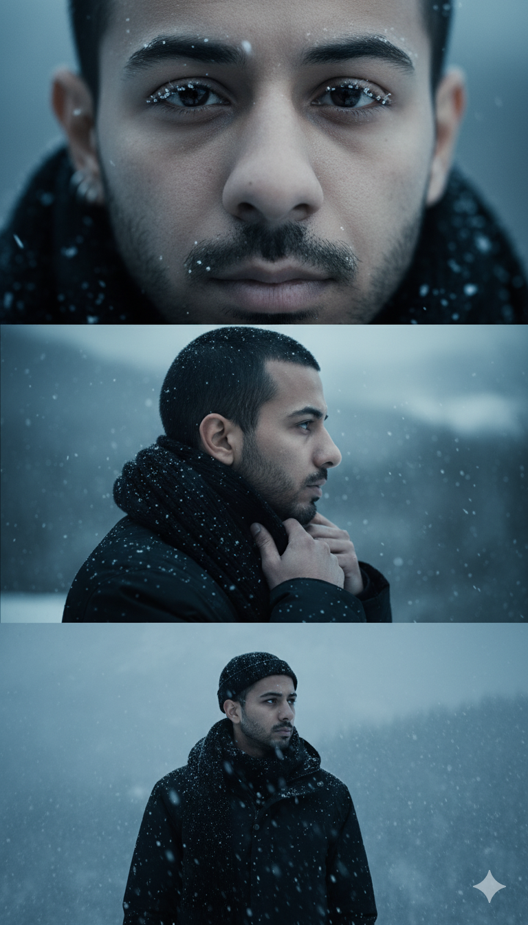 “Ultra-realistic cinematic winter portrait collage, a single vertical composition divided into three horizontal panels (top, middle, bottom).
